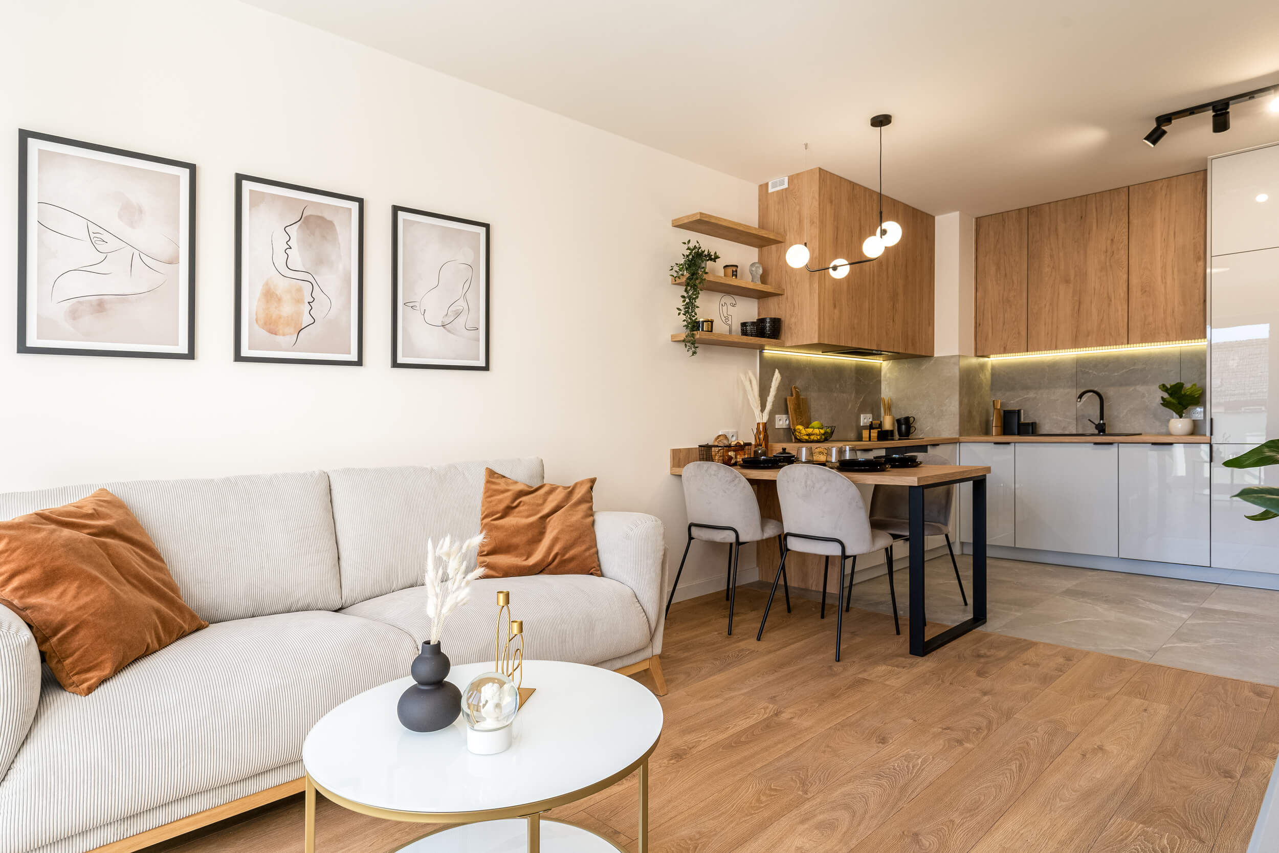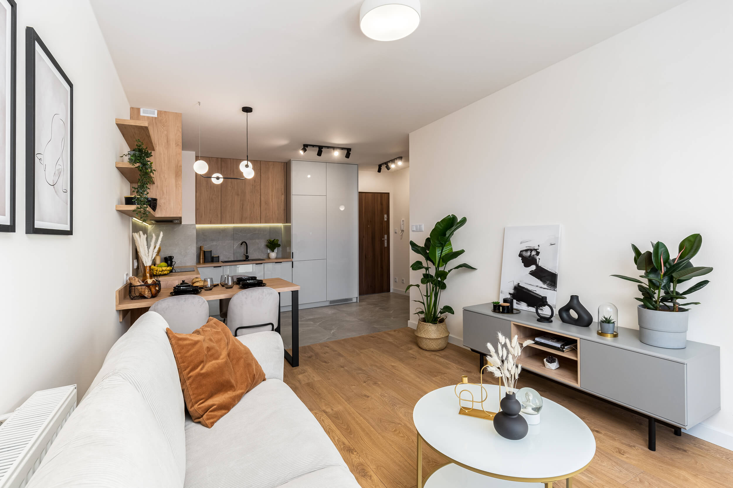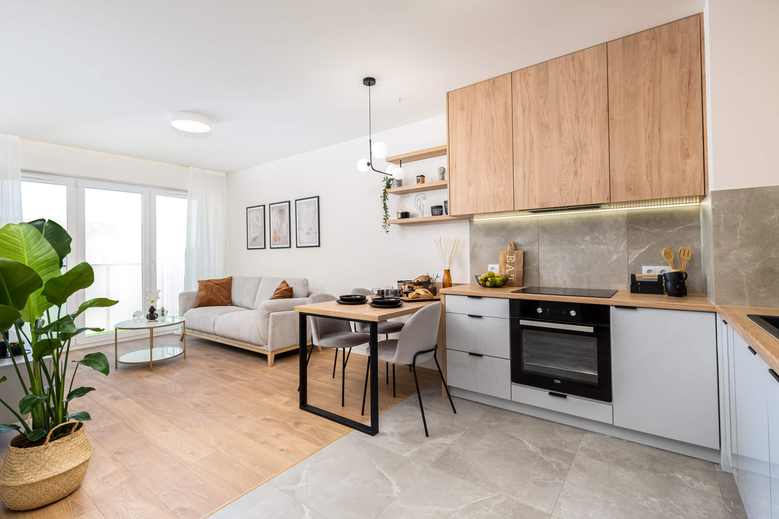 Zlokalizowane na 3 piętrze w kameralnym 4. piętrowym bloku w inwestycji Murapolu "Królewskie Taras" w Wieliczce, oddane do użytkowania w 2020 roku. Remont mieszkania zakończony w marcu 2021. Na ścianach i sufitach gładzie. W mieszkaniu zamontowano drzwi wewnętrzne. Na podłogach wysokiej klasy panele oraz gres szkliwiony. Zabudowy karniszy wyposażono w nowoczesne oświetlenie ledowe. Mieszkanie o powierzchni użytkowej 38 m2 składa się z salonu z aneksem kuchennym, sypialni, łazienki oraz balkonu. Aneks kuchenny wyposażony w piekarnik, płytę indukcyjną, lodówkę zmywarkę i okap oraz pojemne szafki kuchenne wykonane na wymiar. Wszystkie sprzęty są nowe i na gwarancji. W salonie znajduje się wygodna sofa, stolik kawowy, komoda rtv oraz stół z krzesłami. Mieszkanie urządzone sprzedawane jest z całym wyposażeniem i elementami dekoracyjnymi. Łazienka wyposażona w wannę (z możliwością montażu parawanu prysznicowego), umywalkę, szafki na kosmetyki, stelaż podtynkowy z miską WC Grohe oraz duże lustro i kaloryfer ręcznikowy. W mieszkaniu ogrzewanie oraz ciepła woda z centralnej kotłowni gazowej znajdującej się poza budynkiem. Możliwość podłączenia szybkiego Internetu oraz telewizji kablowej.